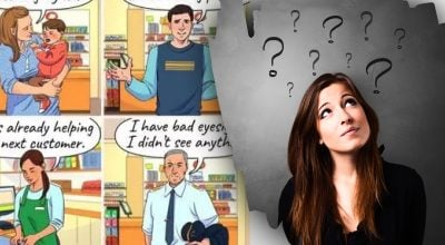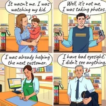 Tudo o que tens de fazer é olhar para a imagem abaixo e identificar q das pessoas na loja roubou a carteira de alguém. Três das pessoas retratadas estão a dizer a verdade, mas uma delas está a mentir.