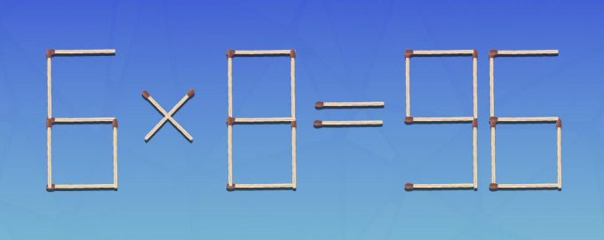Assim, em baixo verá uma imagem em que a igdade 6×8=96 é feita de fósforos. Para a criar, utilizámos 29 fósforos. Obviamente, do ponto de vista matemático, esta igdade não está correta.