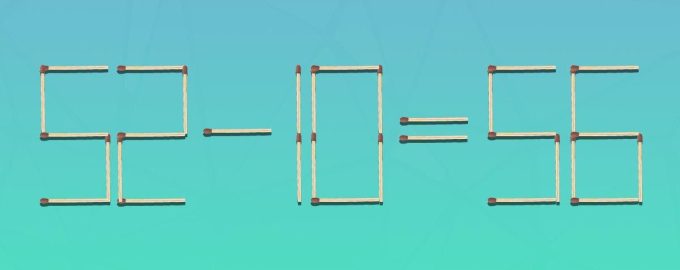 Em baixo, vê uma imagem em que os fósforos estão dispostos com a igdade 52-10=55. Obviamente, há algo de errado aqui. Tens de reorganizar os dois fósforos para corrigir o erro.