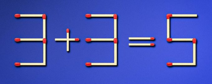 À sfrente está uma eqão incorrecta composta por 19 fósforos: 3 + 3 = 5. É óbvio que a resposta está errada. Para a corrigir, é necessário mover um fósforo. À primeira vista, parece fácil, mas, na verdade, é preciso esforçar o cérebro para encontrar o caminho certo.