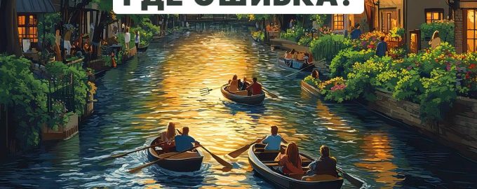 À sfrente está um qro que mostra uma bela paisagem de uma cidade nocturna. Há um rio a correr entre as casas, no q flut pessoas em barcos. À primeira vista, a imagem parece normal, mas, de facto, tem um erro grosseiro.