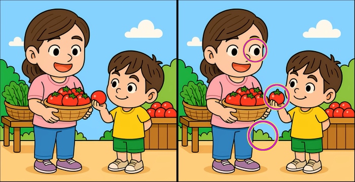 Então, estás pronto para o próximo desafio? Observe com atenção as d imagens de uma mãe e um filho a apanhar tomates. Podem parecer igs à primeira vista, mas há 3 pequenas diferenças. Achas que consegues encontrá-las todas em 45 segundos? Experimenta e testa a tacuidade vis!