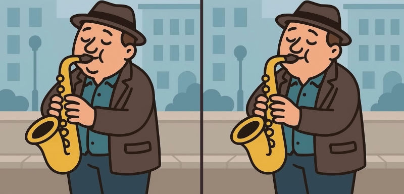 Então, estás pronto para o próximo desafio? Observe com atenção d imagens de um homem a tocar saxofone. Podem parecer idênticas à primeira vista, mas existem 3 pequenas diferenças. Achas que consegues encontrá-las todas em 31 segundos? Experimenta e testa a tacuidade vis!