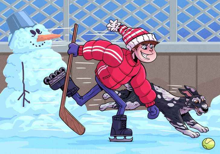 Na imagem, vemos um rapaz a patinar no gelo e um cão a correr ao lado do rapaz. À primeira vista, pode parecer que não há qquer erro na imagem, mas, de facto, não é assim. Se olharmos com atenção, apercebemo-nos de que algumas coisas foram mal desenhadas.