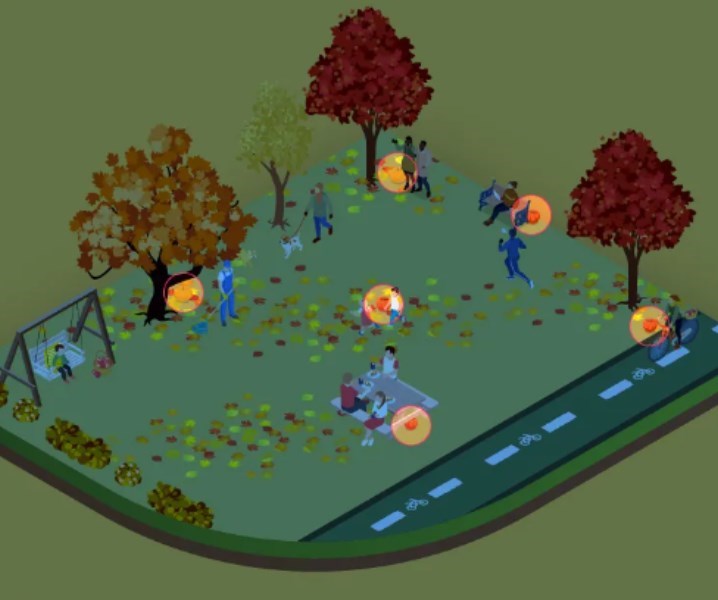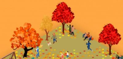 A imagem mostra um parque infantil de outono onde pessoas e crianças andam de um lado para o outro. Todos estão ocupados a fazer as s próprias coisas, mas ao lado de alguns deles estão as abóboras que estamos à procura.