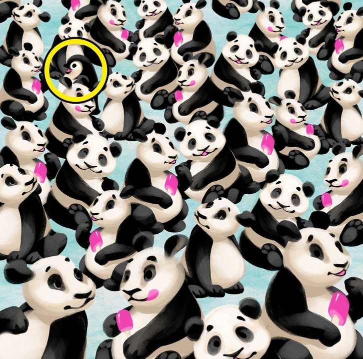 Tenta resolver um puzzle muito complicado e divertido – tens de encontrar rapidamente o pinguim, que está bem escondido na imagem entre muitos pandas.