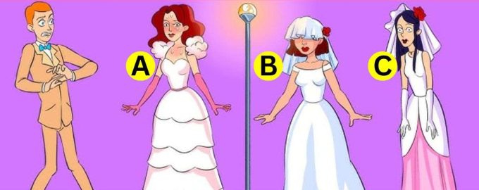 Um homem está a olhar para três noivas com vestidos brancos. À primeira vista, pode parecer que todas as noivas são humanas, mas não é esse o caso. Entre as três raparigas, apenas uma é humana e as outras d são fantasmas.
