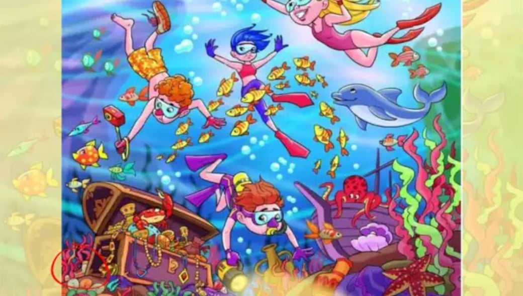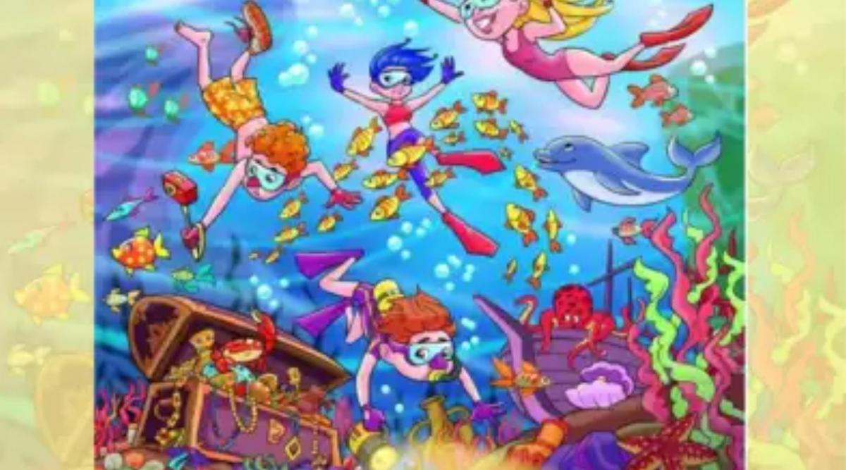 A imagem mostra rapazes e raparigas a mergulhar no fundo do mar. Há polvos, medusas, estrelas-do-mar e outras criaturas marinhas. Até há um tesouro escondido. No entanto, a nossa tarefa é encontrar o sapato que o rapaz perdeu.