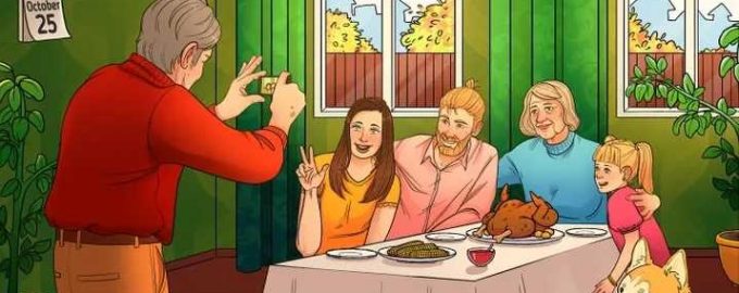 Na imagem seguinte, vemos uma família fotografada à mesa do Dia de Ação de Graças. O facto de a família estar a celebrar o Dia de Ação de Graças é indicado pelo tradicional peru de Ação de Graças na mesa.